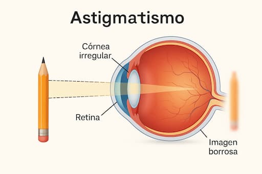 En lugar de ser perfectamente redonda, la superficie del ojo se asemeja más a un óvalo, lo que hace que los rayos de luz no se enfoquen en un único punto de la retina, sino en varios. Esto genera visión borrosa o distorsionada a cualquier distancia.
