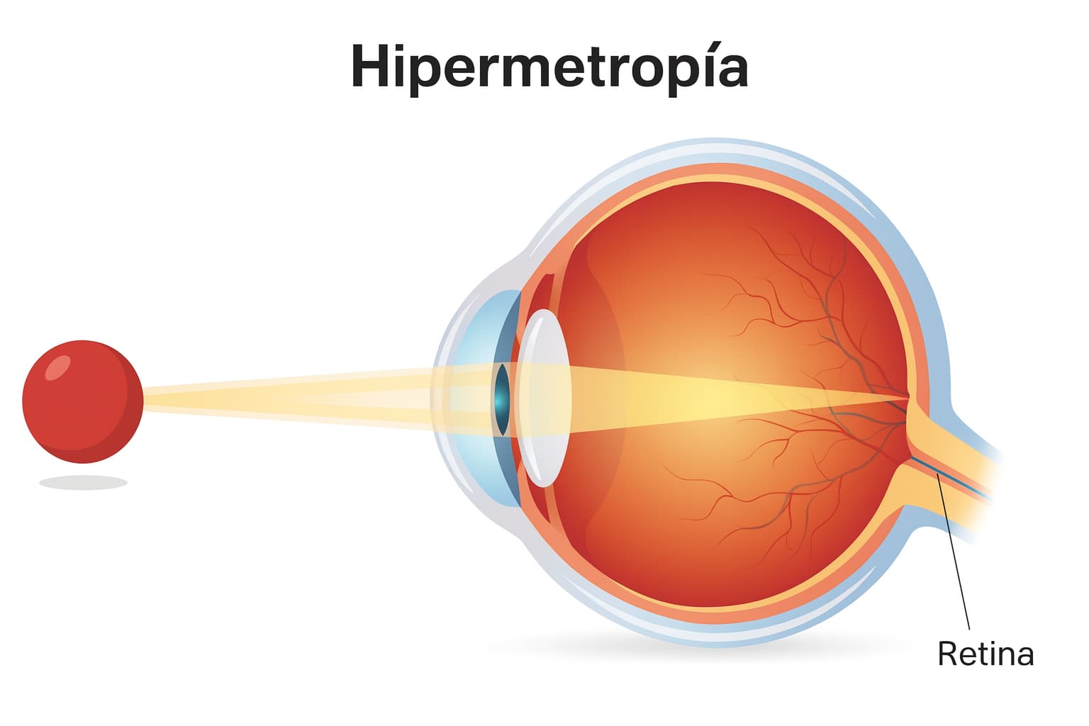 En un ojo normal, la luz que entra se enfoca directamente en la retina, lo que permite una visión nítida. En la hipermetropía, el globo ocular es más corto de lo habitual o la córnea tiene menos curvatura de lo normal, provocando que la luz se enfoque detrás de la retina en lugar de sobre ella.